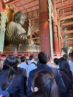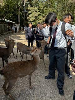 薬師寺にてお坊さんの楽しくもためになるお話しに心つかまれた様子。奈良公園では奈良の大仏の大きさに驚き、鹿と戯れました。